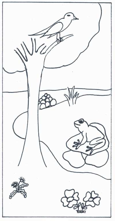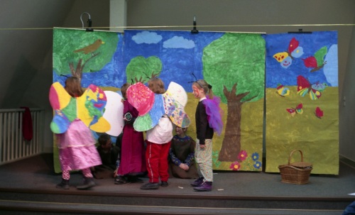 The scenery is divided into three parts. On the central scenery you can see a meadow with flowers and trees. On the scenery to stage left a frog in a waterhole and a cuckoo on a tree and on the right part butterflies can be seen. The three narrators are sitting in the front of the scenery to stage right. Narrator 1: Once upon a time there was a little hedgehog. His name was Hector. Narrator 2: On a nice summer day he strolled across a meadow. The little hedgehog enters the stage and walks a few times from one side to the other. Narrator 1: Then his little friend came running to the meadow. Her name was Holly. The Narrators leaves the stage. Holly Hedgehog: Hello, Hector. How are you? Hector Hedgehog: Hello, Holly. How are you? Holly Hedgehog: Please, tell me Hector, can you just wish yourself happiness and then really get it? Hector Hedgehog: No, that's not possible, Holly. Holly Hedgehog: But perhaps at least a short happy moment, would that be possible? Hector Hedgehog: That I don't know, Holly, but I don't think it will work either. Holly Hedgehog: Shall we try it out once? Would you like that, Hector? Hector Hedgehog: Oh yes, Holly, but how can we do that? Holly Hedgehog: We just say: we are wishing us a happy moment and then we lay down here in the grass, look to the sky and are quite alert. They do so. Hector Hedgehog: Do you sense already something, Holly? Holly Hedgehog: I feel a little bit dizzy. At this moment a loud croak can be heard. Hector Hedgehog: Hallo, what's this we've got there? Now the frog hops on the stage, dances a "frog-dance" and stops. .... Proposals for sceneries ![]() Left side .... Photos of the production ![]() ![]() |