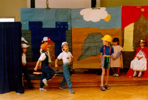 The capital of this kingdom was Babylon. Points to the stage sets. Narrator 3: The King of Babylon was called Nabopolassar and he had his palace in Babylon. Points to the King’s palace.Nabopolassar comes on stage, behind him, two slaves, who carry an umbrella and fans. He takes his seat on the throne.