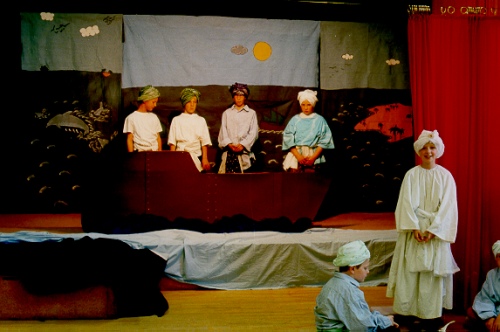 Excerpts: The Hearts of the Sailors: Prologue The stage set is split into three parts. The left part shows a jumping dolphin,. the right part a Dhow. On the center part,( from the perspective of a roof-terrace), one can see the Port of Mombassa with several ships. All the houses are white and have flat roofs. In front of the center stage set there is a low table with four cushions placed around it. Two students come on stage (step in front of the curtain). Pupil 1: Dear audience, today we would like to tell you a story from long ago. Pupil 2: It is about brave sailors and their ships. Pupil 1: It is set on the Indian Ocean, its islands and coasts. Pupil 2: It is very exciting. Pupil 1: And perhaps it might render you a little thoughtful as well. Pupil 2: Right, let us begin. Com, let’s sit down there. If there is a curtain it is opened now and they sit down in front of the left half of the stage set. End of the Prologue