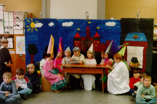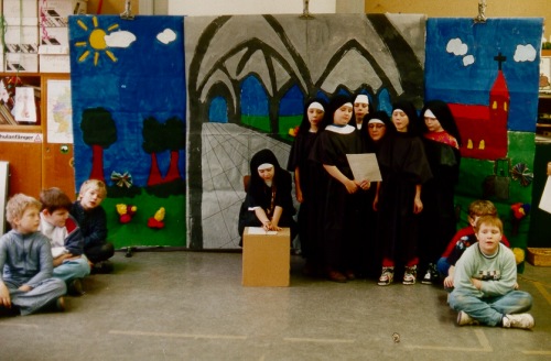 Kloster anfielen. .... Bühnenbildvorlagen Zur Herstellung der Bühnenbilder erstellt man von dieser Vorlage eine Folie, projiziert diese auf die Bühnenbildunterlage, z.B. Tapete, und zeichnet die Konturen mit einem dicken Stift nach. ![]() Ein Ritter des 12./13. Jahrhunderts Linkes Bühnenbild für den 1. Akt ![]() Die Burg Felseneck Mittleres Bühnenbild für den 1. Akt ![]() Der Innenhof des Klosters Mittleres Bühnenbild für den 2. und 3. Akt .... Fotos: