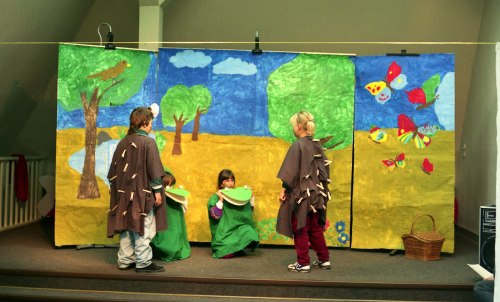 The scenery is divided into three parts. On the central scenery you can see a meadow with flowers and trees. On the scenery to stage left a frog in a waterhole and a cuckoo on a tree and on the right part butterflies can be seen. The three narrators are sitting in the front of the scenery to stage right. Narrator 1: Once upon a time there was a little hedgehog. His name was Hector. Narrator 2: On a nice summer day he strolled across a meadow. The little hedgehog enters the stage and walks a few times from one side to the other. Narrator 1: Then his little friend came running to the meadow. Her name was Holly. The Narrators leaves the stage. Holly Hedgehog: Hello, Hector. How are you? Hector Hedgehog: Hello, Holly. How are you? Holly Hedgehog: Please, tell me Hector, can you just wish yourself happiness and then really get it? Hector Hedgehog: No, that's not possible, Holly. Holly Hedgehog: But perhaps at least a short happy moment, would that be possible? Hector Hedgehog: That I don't know, Holly, but I don't think it will work either. Holly Hedgehog: Shall we try it out once? Would you like that, Hector? Hector Hedgehog: Oh yes, Holly, but how can we do that? Holly Hedgehog: We just say: we are wishing us a happy moment and then we lay down here in the grass, look to the sky and are quite alert. They do so. Hector Hedgehog: Do you sense already something, Holly? Holly Hedgehog: I feel a little bit dizzy. At this moment a loud croak can be heard. Hector Hedgehog: Hallo, what's this we've got there? Now the frog hops on the stage, dances a "frog-dance" and stops. .... Proposals for sceneries ![]() Left side .... Photos of the production ![]() ![]() |