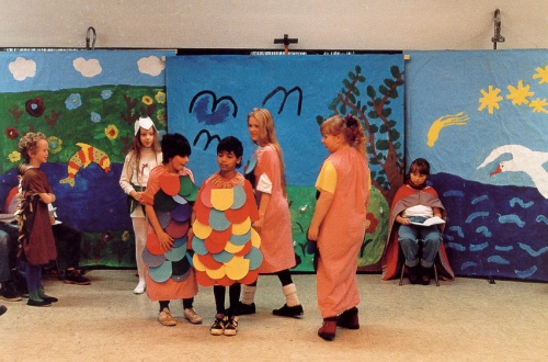 Excerpt: The Very Beautiful Fish The central section of the scenery shows a meadow with flowers and trees. Colourfully shimmering dewdrops are visible on the tall blades of grass. A nightingale sits on a tree. The scenery to stage left shows a lake with fish leaping out of the water. The scenery to stage right shows an albatross flying across the sea. There is a shooting star in the sky. Five narrators sit in front of the set. Narrator 1: Once upon a time there was a little hedgehog. His name was Hector. Narrator 2: One morning he went for a walk in the meadow. Hector Hedgehog comes on stage and walks up and down sniffing the flowers in the meadow. Then after he had sat down to study a flower, lost in thought, a fairy appeared to him. The Day Fairy appears to music. She dances and then stops in front of Hector Hedgehog. Day Fairy: Good morning, Hector Hedgehog. Hector Hedgehog: Good morning. Who are you? Day Fairy: I am a Day Fairy from Fairyland. Hector Hedgehog: Oh, I would love to see Fairyland one day. Could you take me there, Day Fairy? Day Fairy: Yes, Hector Hedgehog, I think I could. Come on, we’ll go! She takes him by both hands and they spin round slowly while some music plays, ending centre stage. Day Fairy: Can you see the dewdrops in the meadow, Hector Hedgehog? Hector Hedgehog: Yes, it looks as if the meadow were covered with thousands of gems. Day Fairy: And do you know why the dewdrops look so beautiful, Hector Hedgehog? Hector Hedgehog: After a clear night there is often dew in the meadow. I know that. But I don’t know why it looks so beautiful, no. Day Fairy: The dewdrops look so beautiful because they are really the tears of stars. Would you like to hear why that is so, Hector Hedgehog? Hector Hedgehog: Oh yes, please tell me Day Fairy. Day Fairy: I’ll tell you. Once upon a time, there was a big white albatross. The albatross comes on stage and some music plays. He flies several times from one side to the other and then stops stage right. Narrator 3: During his long and distant flights across the sea he fell in love with a bright star in the constellation of Andromeda. Narrator 4: The star also loved the albatross very much. She guided him on his flights. She encouraged him when he was in danger due to a storm. And she comforted him when he was feeling lonely. Narrator 5: The love of the albatross became stronger and stronger. And so he decided one night to fly to his beloved star. Narrator 1: He collected all his strength and his courage. He went up in the air and went higher and higher up into the sky. Much higher than any bird had ever flown before. But he couldn’t get any nearer to his star.The albatross flies through the audience while music plays. Then he collapses on the edge of the stage. Eventually his strength failed and, disappointed, he returned to earth. Narrator 2: The star saw all this and was also sad. She missed the albatross deeply. Now she too gathered all her courage, and, turning herself into a shooting star, she left her constellation and went down to earth! A shooting star enters from behind the audience, swinging a bright torch in each hand. Narrator 3: As she came nearer to the earth, she shone brighter and brighter. So bright, that she nearly outshone the moon. But then she broke into a thousand pieces that burned out as they fell to earth. She dashes through to the stage, and leaves stage left. The albatross leaves stage right. Day Fairy: The other stars saw all of this and they cried. During clear nights their tears fall down to earth and you can see them as dewdrops on the grass and flowers. Hector Hedgehog: Now I know why the dew in the meadow looks so beautiful. Day Fairy: Come on, we’ll go further, Hector Hedgehog. They spin round slowly to the scenery stage left. Hector Hedgehog: There is the lake where I often go for a walk. Day Fairy: Look how the fish leap out of the water. Do you know why they look so joyful when they do that, Hector Hedgehog? Hector Hedgehog: No, I don’t know. Please tell me. ....