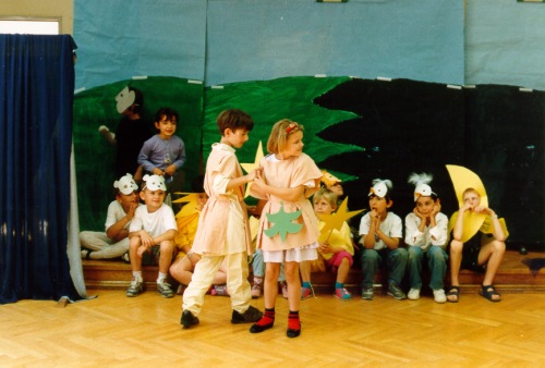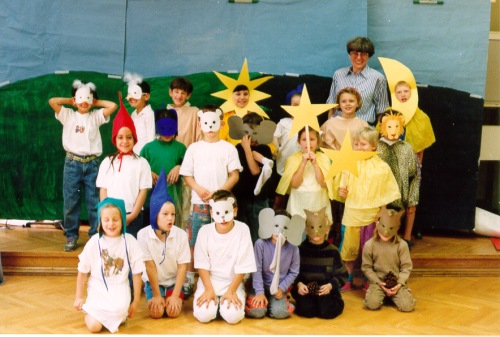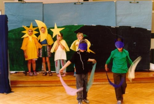 How God Created the World The stage set can consist of one continuous part or it can be divided into three parts (in this case the central part should be wider than the side parts). All stage sets show blue sky in their upper third. The bottom parts each show mixed pieces of land and water (e.g. many small islands) and are detachable. They are detached during the course of the advancing story. Underneath, in the left section of the central part, one will see green land whereas the right section will show the sea. On the right edge of the stage set sit four narrators. A sign reads: “How God created the world”. Narrator 1: Dear audience, we would like to show you now how God created the world (music). Narrator 2: In the beginning, God created sky and earth (points at the upper and lower parts of the stage set). Narrator 3: But the earth was desolate and empty (music). Narrator 4: Then God separated earth from water. Earth became land and water became the sea (music). Change of stage set. Narrator 1: Now, God created the plants: flowers and trees. Two children dressed as flowers come on stage and dance the flowers‘ dance. Then they say. Flowers: We are the daisies (bell flowers or similar). Then they line up in front of the section of the middle stage set which shows land. Then the trees come on stage, dance the trees‘ dance and say. Trees: We are the apple trees (fir trees or similar). Then they line up with the flowers. Narrator 2: And God saw that all was good. Narrator 3: Then God created the sun, the moon and the stars. The sun, the moon and the stars come on stage (together or individually), dance the sun’s dance (stars‘ dance) and line up in a slightly elevated position behind the plants. Narrator 4: This way day and night and the seasons came into existence. ....