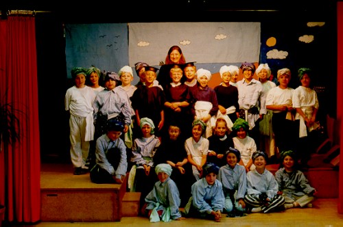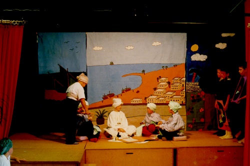 Excerpts: The Hearts of the Sailors: Prologue The stage set is split into three parts. The left part shows a jumping dolphin,. the right part a Dhow. On the center part,( from the perspective of a roof-terrace), one can see the Port of Mombassa with several ships. All the houses are white and have flat roofs. In front of the center stage set there is a low table with four cushions placed around it. Two students come on stage (step in front of the curtain). Pupil 1: Dear audience, today we would like to tell you a story from long ago. Pupil 2: It is about brave sailors and their ships. Pupil 1: It is set on the Indian Ocean, its islands and coasts. Pupil 2: It is very exciting. Pupil 1: And perhaps it might render you a little thoughtful as well. Pupil 2: Right, let us begin. Com, let’s sit down there. If there is a curtain it is opened now and they sit down in front of the left half of the stage set. End of the Prologue