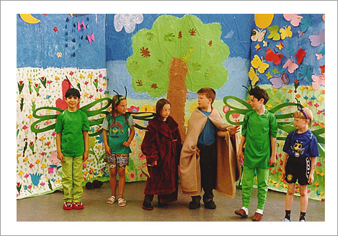 May I Help? The scenery to stage right shows a meadow with flowers and butterflies. The scenery to stage left shows an old hollow oak. The central section shows a wood with fir trees. In the foreground one sees some tall ferns and wild flowers. Two narrators introduce the scene. Narrator 1: Once upon a time there was a little hedgehog. His name was Hector. Narrator 2: One day he went for a walk in a meadow. Narrator 1: Then his little friend came running to the meadow. Her name was Holly. The narrators leave the stage. Holly Hedgehog: Good morning, Hector Hedgehog. Hector Hedgehog: Good morning, Holly Hedgehog. Holly Hedgehog: The sun is shining so nicely. Shall we go for a walk? Hector Hedgehog: That’s a good idea. Where shall we go? Holly Hedgehog: To the river beyond the wood. Pointing to the wood. Hector Hedgehog: It’s rather far. Holly Hedgehog: Perhaps we’ll have an adventure. Hector Hedgehog: Oh yes! I expect we will! Holly Hedgehog: Come on then, Hector Hedgehog. She takes him by the hand and they walk around a little. Now two butterflies appear on stage. Holly Hedgehog: Just look how prettily their wings shine in the sun! The butterflies dance. Holly Hedgehog: You have danced very nicely, Butterflies. Butterflies: Thank you, Holly Hedgehog. The butterflies leave the stage and the dragonflies appear and dance. Hector Hedgehog: Look, Holly Hedgehog! ....