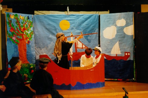 Scene 1 The Navigator Five narrators come on stage and sit down (stand) in front of the right stage set. Arabian music plays. Narrator 1: Many years ago – at a time when sometimes Portuguese caravels could still be seen in the Indian Seas – in the city of Mombassa in Africa, at the shores of the Indian Sea, lived the navigator Achmed Ibn Majid. Ibn Majid comes on stage and sits down in front of the low table and writes. He wears a large turban. Narrator 2: Ibn Majid lead ships from the coasts of Africa to Arabia, Persia, India, to the Sundic Islands, and even to faraway China. Narrator 3: Among the sailors and merchants who were travelling these seas to do trade over there, Ibn Majid was much respected. .... Characters, scene