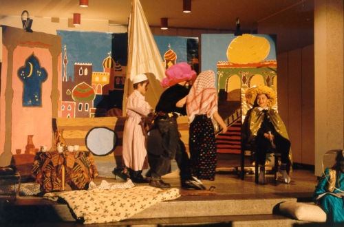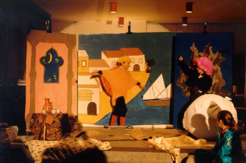 Excerpts: Sindbad The stage set consists of three parts. The left part shows the interior of an arabic house. In front of this “house”, five cushions are put on the floor. The centre part shows an arabic city with a port (the port of Basra with a” dhow”). In this ”dhow”, three children (the Captain and the merchants) are sitting; if possible, invisible for the auditory.). The right part shows an idyllic island in the sea. This “island” later on turns out to be a big fish which will move in the course of the first scene. Scheherazade is sitting on a cushion on the right brim of the stage. An Arabic tune can be heard for a short time.Prologue Two children come to the brim of the stage. Child 1: Dear audience, you surely all know the Arabian Nights. Child 2: 1,000 years ago, these tales have been told by beautiful and bright Scheherazade. She told these tales to the king, each night a different one, for 1001 nights. Child 1: And now, Scheherazade will tell three of her tales to you. Scheherazade bows with her hands folded. Child 2: She will tell you about three voyages of Sindbad the Sailor. The children leave the stage End of the prologue .... First Act: