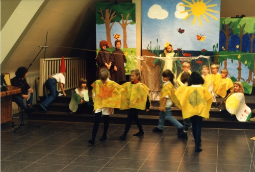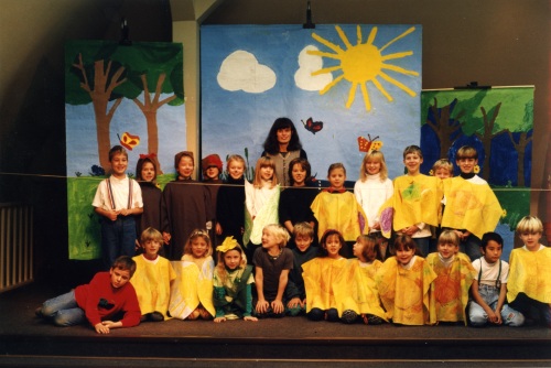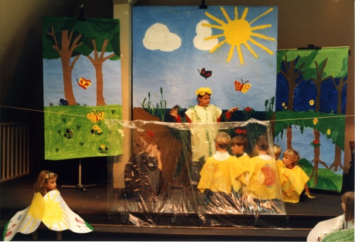 The Pond The stage scenery is divided into three parts. On the scenery to stage left you can see a field with trees, flowers and butterflies. The scenery to stage right shows the surface of a pond which exactly reflects the trees, the clouds and the sky. On the lower part of the central scenery one can see the underwater world of the pond. The bottom is sloping from the left to the right. One can see a shoal of fish, underwater plants and reeds. The underwater world reaches higher than the children. On the upper part the sky and the sun are visible. The reeds reach above the water surface. At the level of the surface of he pond, a foil with two big holes is stretched over the central part of the stage. The holes are big enough for the kids to put their heads through. Exactly underneath the holes chairs or a table are placed. In front of the left stage set sit two narrators. Narrator 1: Once upon a time there was a little hedgehog. His name was Hector. Narrator 2: One day he went for a walk in the field. Hector Hedgehog comes on stage and walks up and down in front of the left stage set several times while some music plays. And then he stops. Narrator 1: And then came the little hedgehogess. Her name was Holly. Now Holly Hedgehog comes on stage and stops in front of Hector Hedgehog. Some music plays. The narrators leave the stage. Holly Hedgehog: Good morning, Hector. Hector Hedgehog: Good morning, Holly. Holly Hedgehog: Listen, Hector, do you know the saying:In the end no one will ever know, If fishes ever kiss or no. Above water they wouldn’t do it, Under water we couldn’t see it. Hector Hedgehog: Yes I do. My grandmother sometimes says it when she’s unsure about something. Holly Hedgehog: But tell me, Hector, what’s the truth? Do they kiss or don’t they? Hector Hedgehog: I don’t know. Holly Hedgehog: I would like to know! Shall we try and find out? Hector Hedgehog: Yes, but how are we going to do it? Holly Hedgehog: We go to the little pond over there at the edge of our field and simply ask the fishes. She points to the pond ....