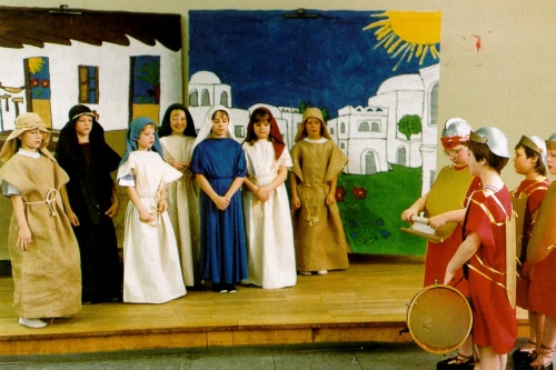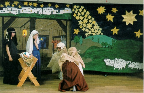 Scene 3 In Bethlehem The stage set is divided into two parts. On the left one can see the inside of a stable with animals. The stable has a flat roof. Above there are some more white houses with flat roofs and further above, the stars and the sky. To the right a landscape at nigh can be seent. In the sky there are many very small stars, the Milky Way and a large star. On the earth one can make out a flock of sheep. A Christmas carol is sung and a sign reads ‘In Bethlehem’. Mary and Joseph stand in front of a cradle. If possible they are spotlighted so that the shepherds who are in front of the right stage set can not be seen. Mary takes the child from the cradle onto her arm. She says. Mary: I have a beautiful child, more perfect than a flower made from gold. I wouldn’t give it away for the whole of Galilee and Israel. (Music playing) She puts the child back into the cradle. Joseph: Mary, this child has been born for all the people in the world. Mary: I know, Joseph, and this is why my heart is a bit scared as well. Joseph: God will protect us and his child. Look, already yesterday he helped us again, when he provided this accommodation for us. Even though there was no space left anywhere. Now the spotlight is taken off Mary and Joseph and moved to the shepherds. One can hear the bleating of sheep and the howling of the wind. The resting shepherds pull their blankets up. Shepherd 1: It is just another cold night. Shepherd 2: I will try to fan the fire. Does that. Now, if possible, the night sky should be spotlighted by an additional light which would make it even brighter. The shepherds then make gestures which show that they are fearful. For instance they put their hands in front of their eyes, move closer together, etc. The voice of an angel speaks. Angel: Don’t be afraid. I am announcing a great fortune which will be shared by all people. Because today the Saviour is born, who is Christ, the Lord. And here is my clue: you will find the child wrapped in a cloth and lying in a cradle. (music playing) Now a choir takes over. Choir: Shall God in the sky be honoured and may peace on earth bring pleasure to the people. The light is now dimmed back down again. Shepherd 3: Let us go to Bethlehem and witness the story which happened there! They go to the stable. The light follows them. Shepherd 4(pointing to the child in the cradle): Look, there is the child in the cradle, just as predicted! Shepherd 5: It really is the Saviour for all people, also for us. Shepherd 1: Let us pray to it! They go down on their knees. After a short while they get back up and give presents to Mary and Joseph. Shepherd 1: Here you are. I’m sure you can do with some milk. Gives Joseph the milk. ....